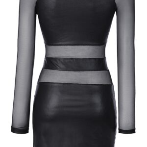 Robe courte noire très sexy, ornée de 2 bandes horizontales transparentes en tulle qui laissent apparaitre le ventre et le creux des reins.