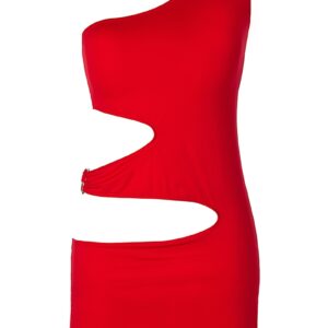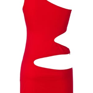Mini robe rouge fabriquée en tissu microfibre doux et extensible ouverte à l’épaule droite, au creux de la taille et juste au dessus des fesses.