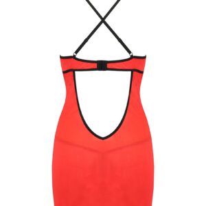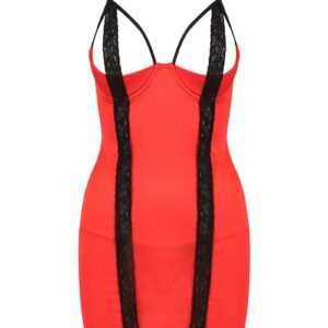 Moulante et en tissus satiné d’un rouge éclatant, cette robe qui épouse la silhouette affirme sa sensualité avec son bustier semi ouvert qui cache l’essentiel sous des artifices de lingerie particulièrement provocants.
