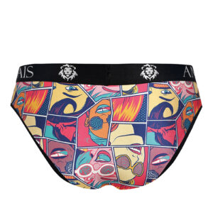 Ce slip sexy est fabriqué en tissu imprimé de visages inspirés des comics et du pop art.