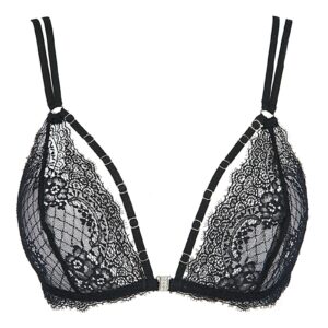 La dentelle délicate qui compose cette lingerie se termine par des cils pour un effet glamour. Ce soutien-gorge est doté dune double bretelle réglable à larrière pour sadapter à toutes les poitrines. Il se ferme à lavant avec le fermoir dissimulé sous les strass brillants en zircon au creux des seins. Une bretelle décorative contourne le haut des seins et leur donne du brillant grâce aux multiples passants argentés qui y prennent place.