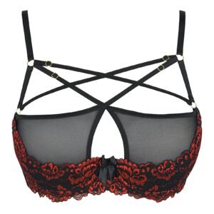 Raffiné avec sa dentelle noire brodée de rouge qui souligne le dessous des seins, sensuel avec ses bonnets de fine résille sanglés sur la poitrine, ce soutien-gorge sexy et original est un véritable accessoire de mode.