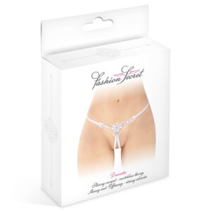 String blanc minimaliste et hyper coquin, ouvert à l’entre-jambes, avec motif en dentelle et des ornements, par la marque de lingerie libertine Fashion Secret.