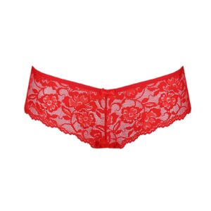 Ce joli petit string taille basse en dentelle rouge transparente et extensible, est une une petite lingerie qui offre un effet maximum.