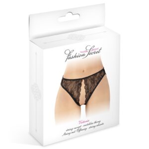 Le string ouvert noir en dentelle et en tulle Victoria de la marque de lingerie Fashion Secret est à la fois sexy et très tendance.