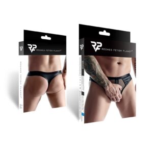 Le string noir pour homme de la marque Regnes Fetish Planet est très agréable au toucher. Cette lingerie sexy fabriquée en wetlook et résille est parfaite pour mettre en avant votre fessier et vos parties génitales.