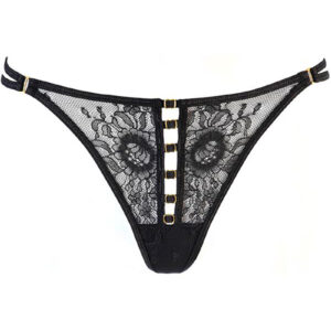 A l’avant la dentelle délicate est dotée d’une ouverture verticale maintenue par des petites bandes élastiques décorée d’un petit bijou dorée semblable à un passant de bretelle.