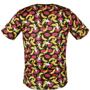 Ce t-shirt sexy est fabriqué en tissu noir au motif de bananes et lèvres pulpeuses.