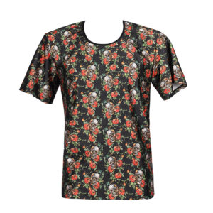 Ce t-shirt sexy est fabriqué en Tissu doux imprimé de crânes et roses esprit RocknRoll.