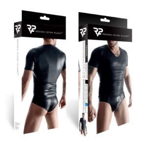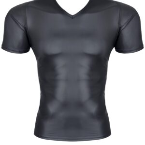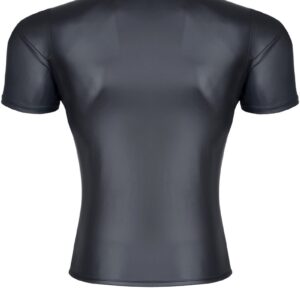 T-shirt noir en tissu wetlook pour homme de la marque Regnes Fetish Planet avec une fine bande noire sur le col en V. Les coutures noires apparentes au niveau des bras et de la taille sont renforcées et lui donnent un côté sexy, viril et chic.