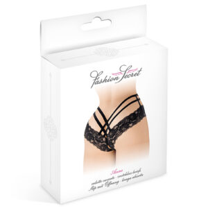 Tanga noir à la fois sophistiqué et coquin, ouvert à l’entre-jambes, avec motif en dentelle et bandes croisées, par la marque de lingerie libertine Fashion Secret.
