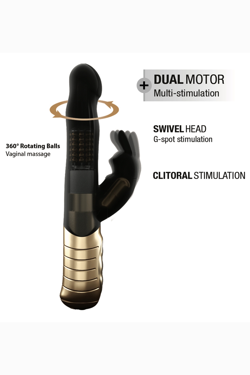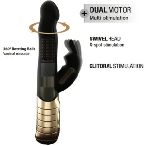 Le petit lapin vibrant sur le côté s’occupe de la stimulation clitoridienne tandis que des rangées de billes tournantes situées dans le corps du vibromasseur décuplent la stimulation vaginale à chaque va et vient du sextoy.